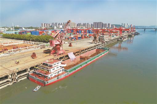 萬噸級貨輪靠泊,考驗的是港口的管理和服務能力。長沙新港之前僅有5臺5噸級起重機,港口貨物往來繁忙時,無法滿足貨物裝卸需求,易導致港口船舶滯留。現在,長沙新港改用大噸位起重機,1小時可裝卸500噸貨物,極大減少船舶滯港時間。今日到港的1.1萬噸進口鐵礦石,可裝滿180多節火車車廂,連起來近3公里長,但不到24小時便能裝卸完畢。