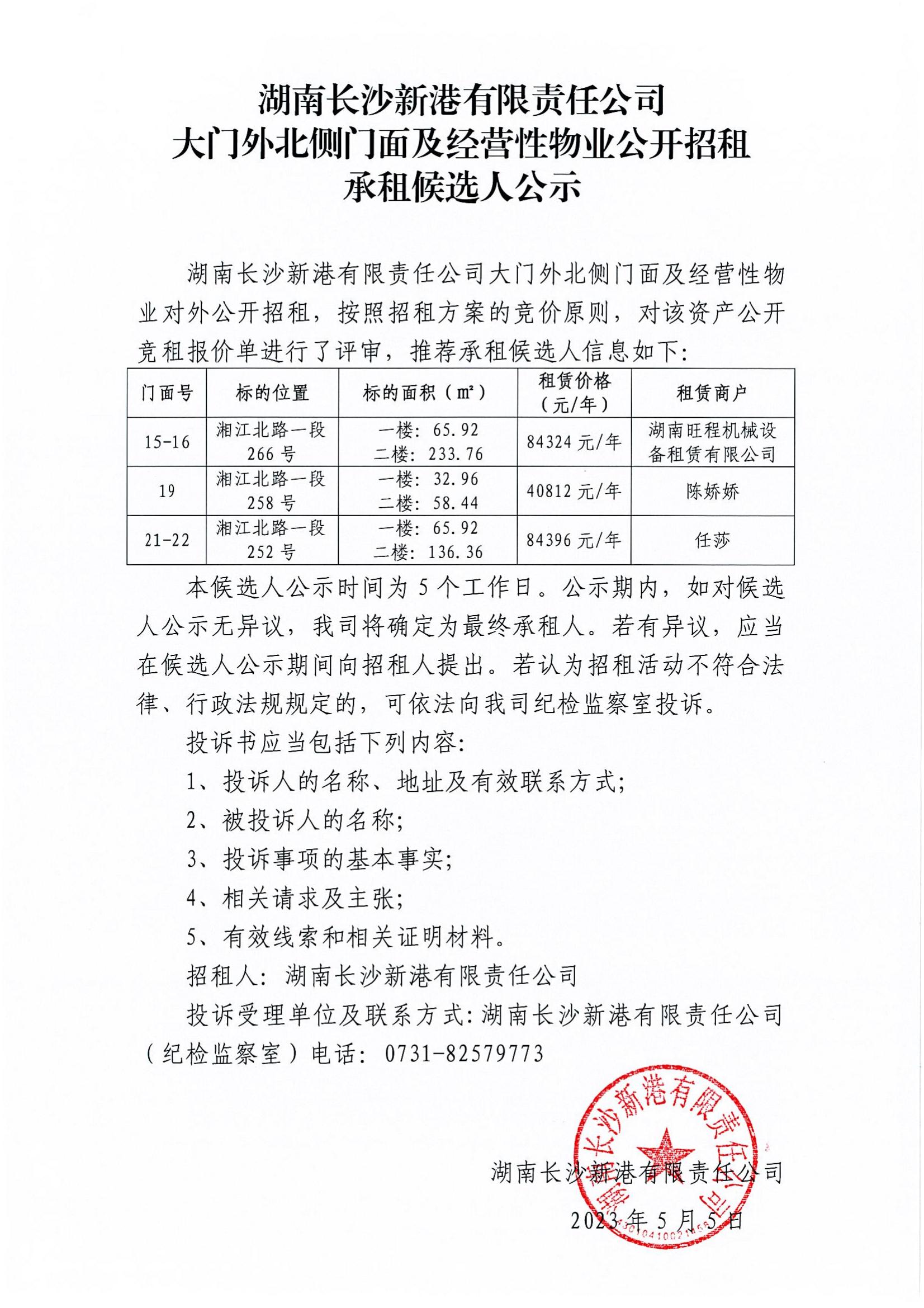 新港公司大門外北側門面及經營性物業公開招租承租候選人公示