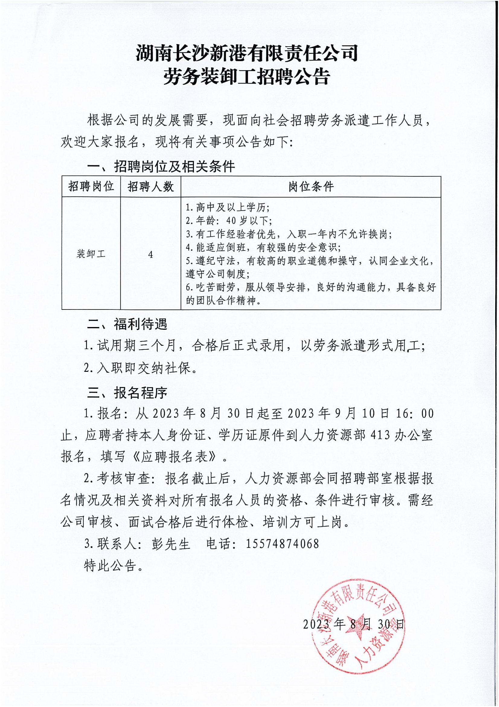 湖南長(zhǎng)沙新港有限責(zé)任公司勞務(wù)裝卸工招聘公告