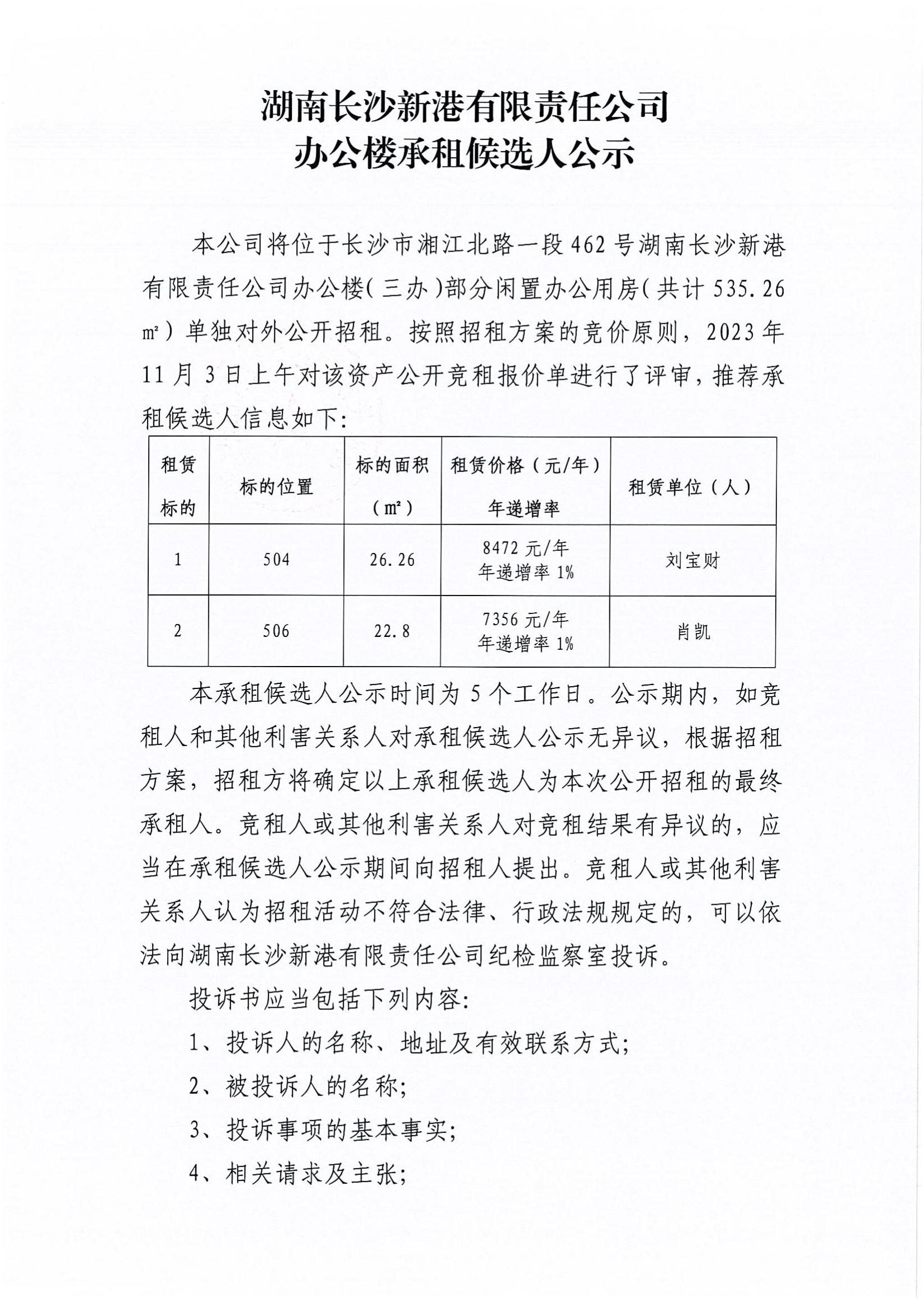 湖南長沙新港有限責任公司辦公樓承租候選人公示