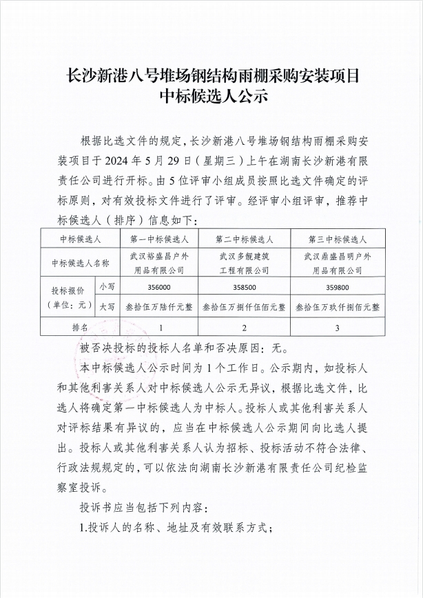 長沙新港八號(hào)堆場鋼結(jié)構(gòu)雨棚采購安裝項(xiàng)目中標(biāo)候選人公示